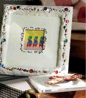 用纸黏土捏成条状粘在普通的相框上,趁未干的时候粘上扣子、小珠子等装饰物,要大小错落排开,并选取不同的色彩。如果要上色,则需要等纸黏土干透再进行。