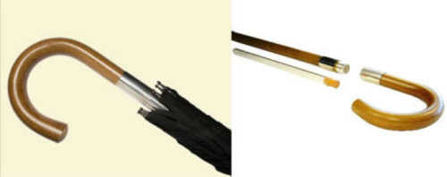 这种雨伞的手柄是马六甲手杖,手柄又分成两节,里面装有一个细长的可以装酒和其他饮品的细长的瓶子。这种伞非常实用,但是价格相当昂贵。