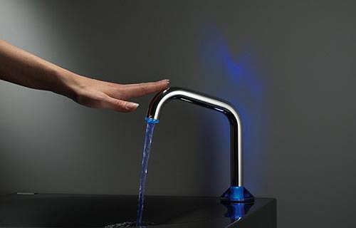 这款看似普通的长颈龙头,仔细看发现没有阀门,如何控制它的开关呢?原来它是一款触摸感应式的半自动龙头,只要轻轻碰触龙头就能控制开关,还能调节水温呢!