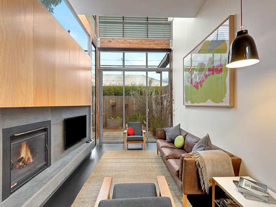 编辑点评:客厅与餐厨以三级楼梯的梯度来区分空间,使客厅区域独立却又不显得突兀。内嵌的客厅墙壁为电视和壁炉腾出了空间,既美观又整洁。