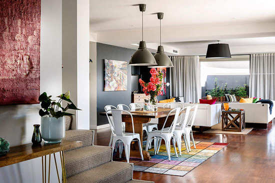 编辑点评:开放式的客厅和餐厅设计使室内空间更加宽敞,通过不同颜色的植物和抱枕,还有墙上的艺术挂画来活跃客厅氛围,色彩搭配十分融洽。