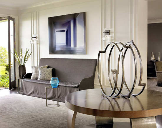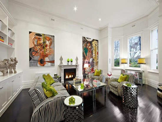 编辑点评:四个金属感的圆桌摆放在四个角,从视觉上固定了客厅空间,与中心的金属方桌相搭配,为客厅带来一丝摇滚的味道。白色储物柜简约大方,斑马纹沙发椅和黄绿色抱枕带来原始风味,抽象的艺术画则让客厅充满文艺气息,混搭风格的客厅魅力四射。
