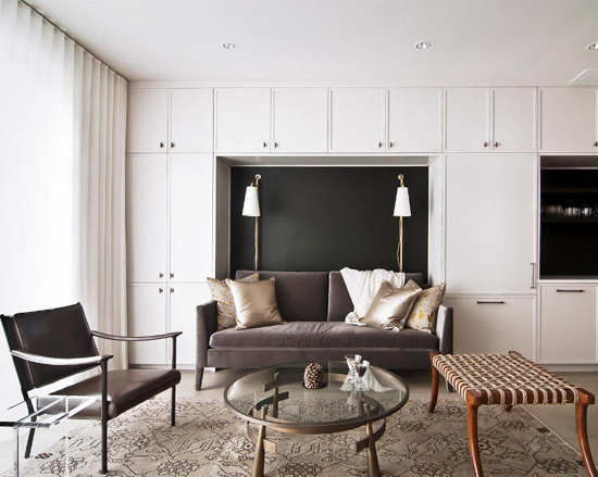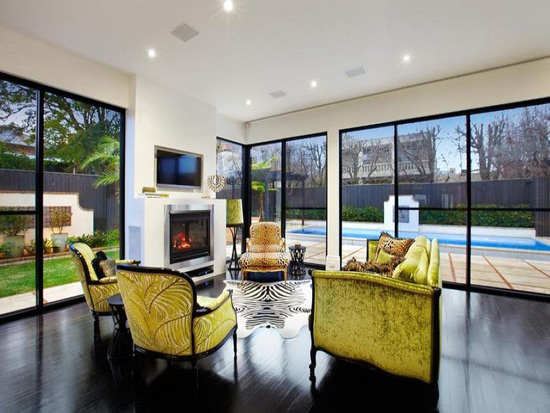 编辑点评:内嵌式的电视机和壁炉共用一墙,大大地节省了空间,也让休息区在视觉上显得更加干净和整洁。呈三角形摆放的沙发椅使宽敞的空间变得饱满,中央的斑马纹地垫增强了休息区的原始风味。