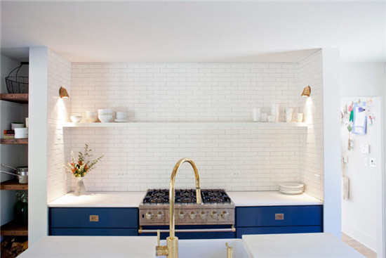 编辑点评:在小厨房中,如果空间不足以安置太多的储物柜,不妨在墙面上加上一些隔板,这样就可以解决台面空间不足摆放餐具的问题;这款对称的厨房收纳设计,又为整洁加分。