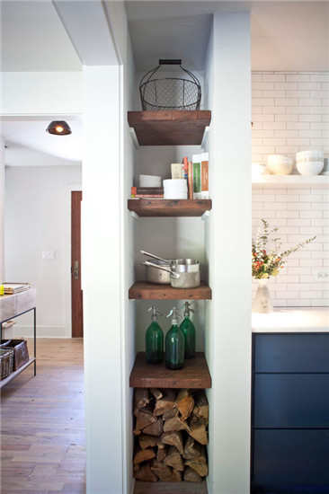 编辑点评:将不影响房屋承重的柱子挖出一道“缝”,加上一些隔板,也就有了收纳摆件的空间。