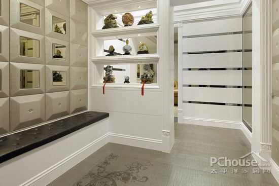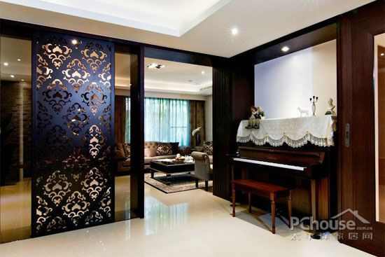顺着玄关的动线前进,华美的线条停在前方短屏风的屋主珍藏上,让进入主体空间的过渡线条收在艺术语汇里。