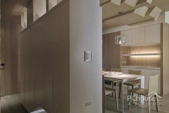利用珠帘搭配实木柱的几何镂空造型设计,突显客、餐厅透明视觉效果,将两边景致似有若无的融合,成功带动一楼空间律动。