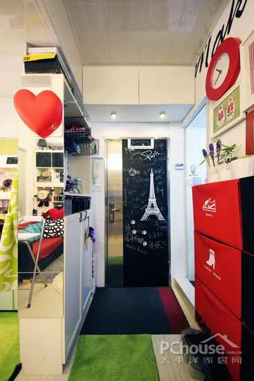 进门发现玄关被月用一个书架改造的鞋柜隔开,旁边的就是厨房,原本封闭的厨房被打通,空间顿时开阔不少。
