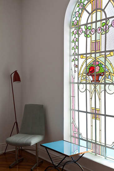编辑点评:在细小的角落里放上桌椅和落地灯,配上大面积的窗户进行采光,小角落便成为了休闲阅读区。图案亮丽的彩绘玻璃为阅读区创造出一种赏心悦目的和谐氛围,增添了浪漫迷人的现代情调。