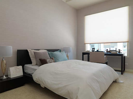 编辑点评:位于卧室的办公桌,不必大张旗鼓,只需小巧实用,这张办公桌便是如此。另外卷帘式的窗帘可以根据实际情况来调节明暗度,以供需要。