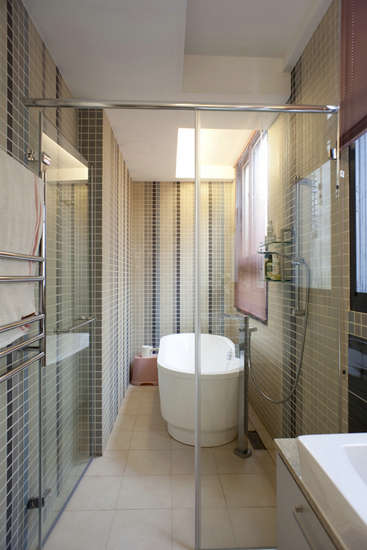 编辑点评:日式浴室设计给父母使用,空间的规划都考虑到长者的使用习惯与安全,所以降低淋浴间的配置高度,将来可铺上木地板,方便长辈坐下来淋浴。