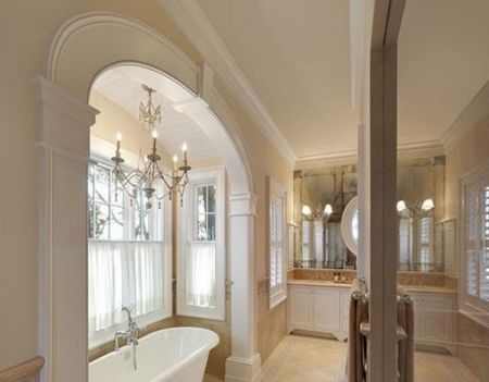 编辑点评:采用椭圆形浴缸,放置在宽阔的浴室的中央,相比于长方形浴缸带有的棱棱角角,这样的造型更为和谐。