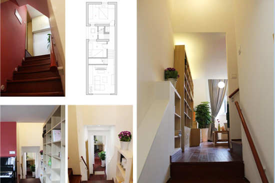 所以我们需要做的就是在这有限的空间里去挖掘空间,还有改造楼梯坡度,改到45度以下。我们第一从竖向开始空间的开拓。我们就发现原有的住宅里一楼角落有个小的厨房间,我们把本来两层的空间进行重构,增加了一层。在储物间进行加层,达到夹层的作用,结构做的非常薄,高度也是不一样的。经过这样改造之后,面积多了二十平方米,这样就好办多了。我们在原有卧室的旁边增加了一个卧室,底下原有的大卧室改造成一家人一起的起居室。