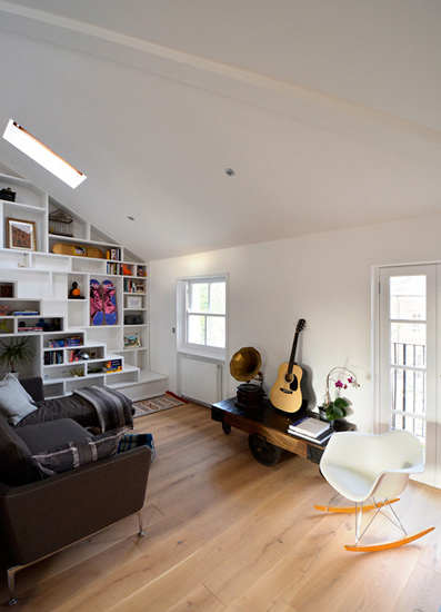 编辑点评:通往卧室的楼梯与书架合为一体,书架部分创造了收纳空间,楼梯和大小不一的格子则为空间营造了层次感和动感,二者的和谐搭配让客厅充满质感。