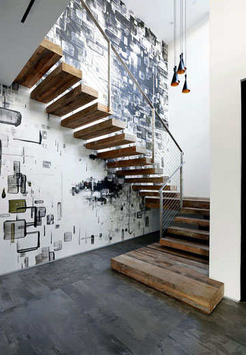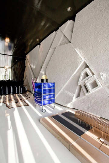 黑白配经典:几何立体白墙和亮面黑色天花板。