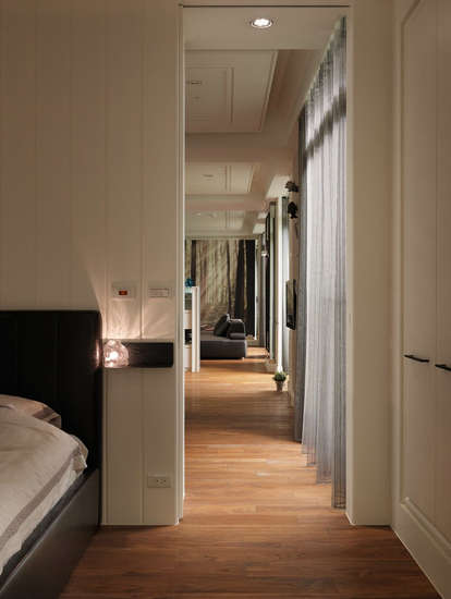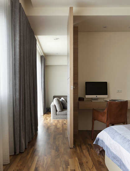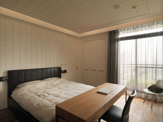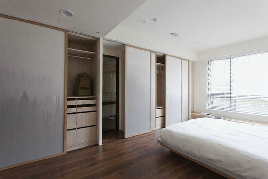 编辑点评:暗藏通往主卫浴的柜体,设计师以山水泼墨意象壁纸贴饰柜面,打造清晨山岚轻笼般的自然写意。