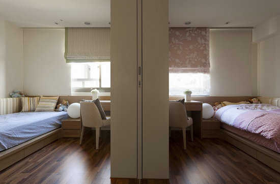 编辑点评:两个儿童房用活动拉门隔断,配置出两间大小一致且格局一样的儿童房,开启时走廊的宽敞区域也是小朋友最佳玩耍的地方。
