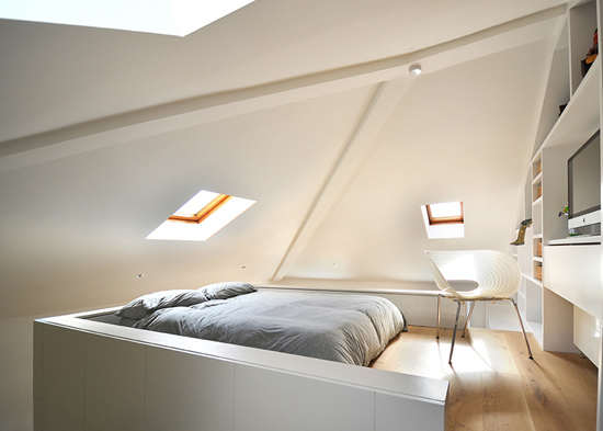 编辑点评:大床没有设置床架,降低了床铺的高度也节省了空间。U型的矮墙包围着大床,而且比较接近吊顶,所以卧室的隐私和安全得以保障。天窗保证了这个相对封闭的空间有充足的采光。