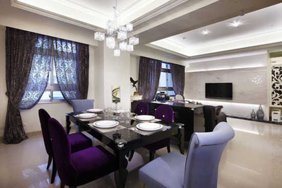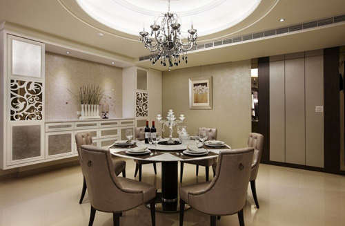 编辑推荐:业主喜爱的华丽感以水晶灯展现,餐柜的柔性花纹包围住用餐区,打造出独立空间的整体美。