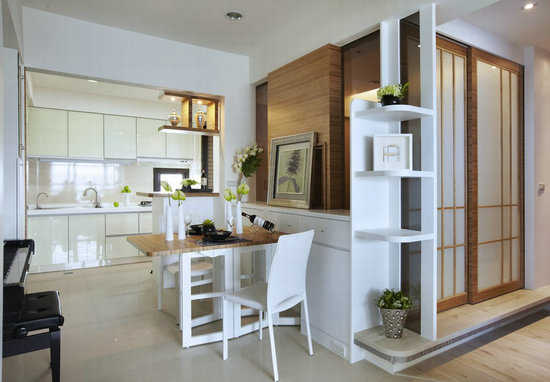 编辑点评:半开放厨房把空间界线向后推,达到放大空间的效果,也透过拉门解决了油烟问题。