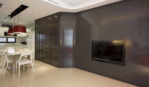 编辑点评:同样的深色调性在餐厅天花上潜处定义吊灯位置,让灰与白持续且深刻对话。