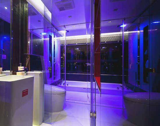 编辑点评:卫浴延袭一贯的简洁风,但是两个小小的壁灯,又令这个简单的洗手间更添趣味;壁灯刚好正对两个小窗户,共同增加卫浴的光亮度。