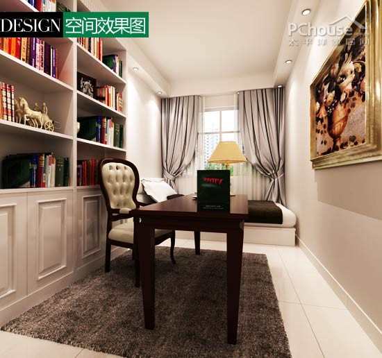 设计解读:继续唱响白色简约的主旋律,书柜采用带有些许美式风格的线条设计,配以深木色的书桌书椅,空间色彩得到绝妙的搭配。