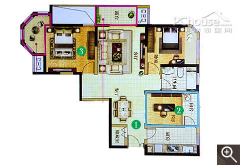 1、入户有储藏室,与厨房正对,导致餐厅空间狭小,就餐环境不佳。