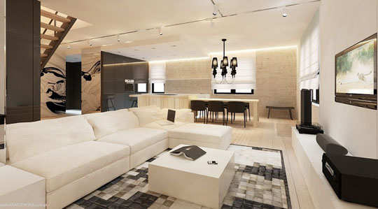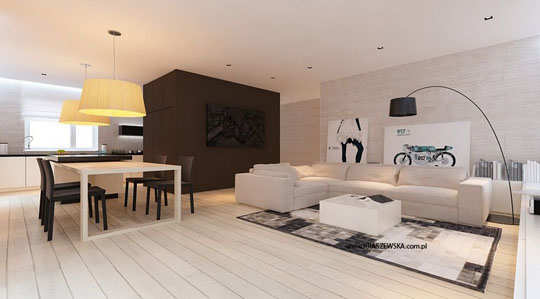 编辑点评:公寓采用统一的仿木质地板,使区域过渡更加自然,同时也提升了空间的清新感,再加上半开放式的功能区设计,充分地扩阔了空间感。