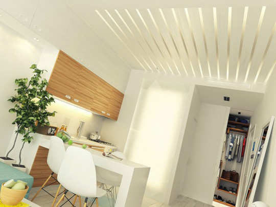 编辑点评:线条跳跃式天花板设计,巧妙分区,为这简约的居室带来线条美,质感轻盈,柔化光源,提高整体空间的格调。