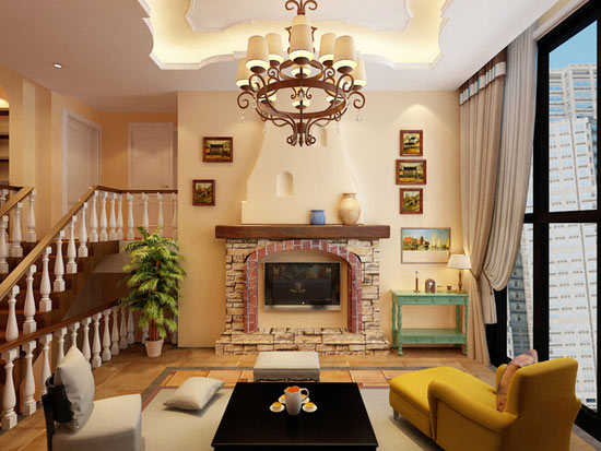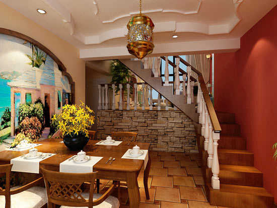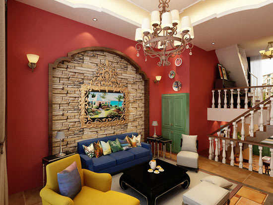 本案所采用的是地中海风格色彩搭配中的黄、蓝紫和绿:南意大利的向日葵、南法的薰衣草花田,金黄与蓝紫的花卉与绿叶相映,形成一种别有情调的色彩组合,十分具有自然的美感 不修边幅的线条:线条是构造形态的基础,因而在家居中是很重要的设计元素。地中海沿岸对于房屋或家具的线条不是直来直去的,显得比较自然,因而无论是家具还是建筑,都形成一种独特的浑圆造型。