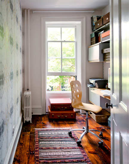 编辑点评:窗台附近的两个收纳箱方便了书房物品的存放,箱子叠起来更可作为小桌子摆放常用的文件和书籍,其棕色的外观与木地板和谐相融,收纳空间“隐藏于无形”。窗户采用上下推拉式设计更能节省空间。