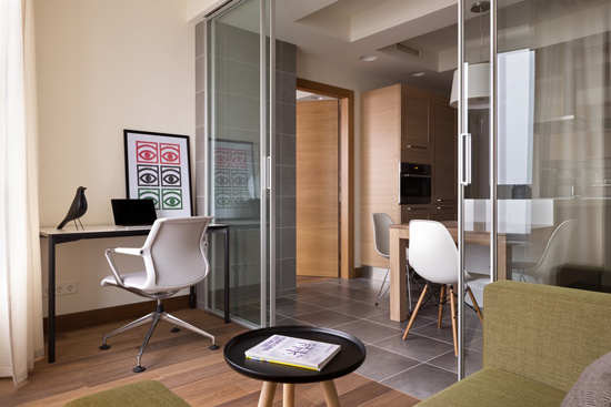 编辑点评:书房与餐厨空间采用玻璃移门作隔断,有效地扩大了空间感。从书房看餐厨空间,在复式吊顶和格子地砖的共同作用下,空间的立体感异常强烈。