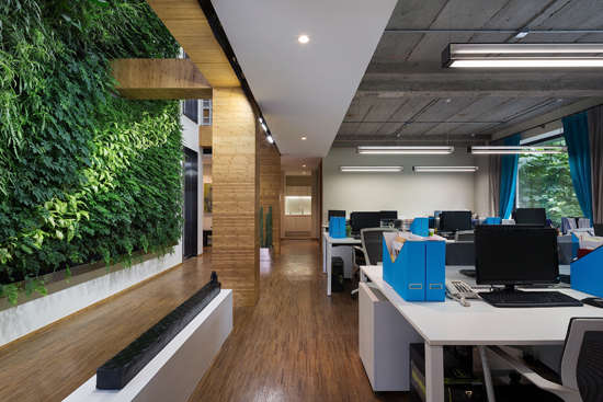 设计亮点分析:二楼到四楼设计师对原有空间做了大胆的调整,通过三楼四楼的挑空,辅以大面的垂直绿化,使得毫无关联的空间一下活跃起来,并由此带来满眼的绿色,仿佛置身于花园里办公。
