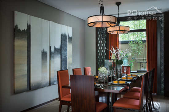 行进空间,高且密的竹林小道,造成的静逸情绪延续到紧致花园,直到步入室内玄关,落地玻璃让室外花园成为借景,设计师在此,用深色木作,工整的线条,严谨静态的摆放,造成时间的停顿和空间的逼仄,为进入客厅和餐厅的舒畅宽阔作铺垫。