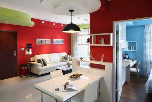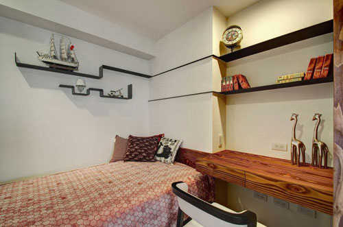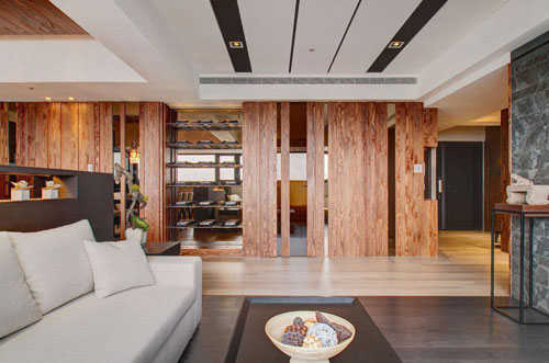 编辑点评:错落的立体线条内,结合茶玻与茶镜隐藏进入小孩房、客卫浴及客房的门片,将机能动线全面包覆,齐整的线条完整放大公共空间。