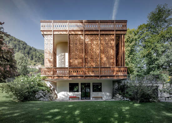 把木头雕刻成华丽的图案形成屏幕围绕着这个在湖边的别墅,由维也纳设计师Alexander Diem设计。