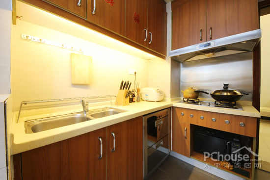 挑选理由:L型的橱柜让空间利用得更好,木纹理的橱柜面板材料,让橱柜赋予了更多的田园气息。
