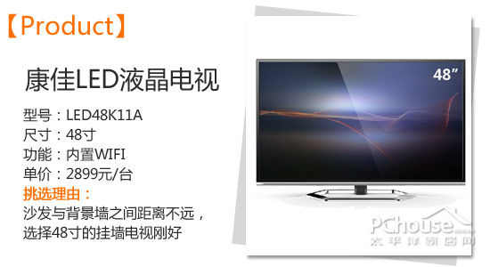 挑选理由:考虑到客厅的布局,沙发与电视背景墙之间的距离不远,所以选择48寸的挂墙电视刚刚好。