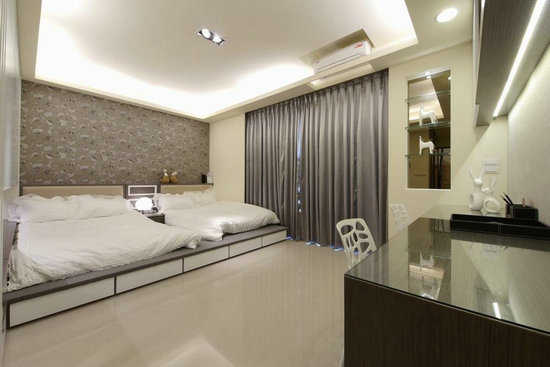 编辑点评:由于是休憩用途的空间,主要照明不需太过明亮,因此设计师以柔和的间接照明为主,书桌还加上LED灯光,让小朋友在良好的环境下阅读。