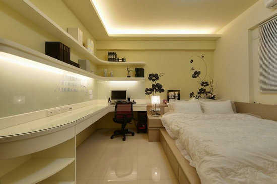 编辑点评:导入流线曲度下的桌面设计,让空间更显活泼轻盈。床铺下方以大容量的收纳配置,争取最完整的空间利用。