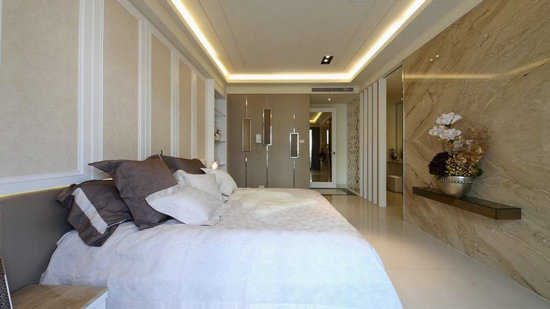 编辑点评:面宽五米的房间,因设计师掌握精准的视觉比例,使主卧房能有大更衣室机能,又能维持开阔明亮的大器尺度。