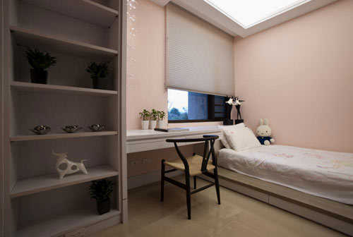编辑推荐:满足正值青春期的小女孩对空间的想望,用粉红色大胆点缀,流动的音符成为抢眼的床头造型,但设计师仍不忘挑选可供屋主替换的弹性作法,若想改变颜色和心情,简单换个窗帘或壁贴,就可有焕然一新的全新风貌。