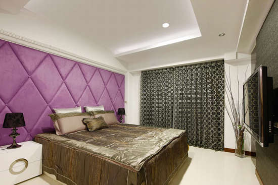 编辑推荐:主卧因应女主人喜欢紫色的需求,于床头墙面以紫色绒绷布效果呈现,落地帘幔则选用圈圈花纹搭配,细看床头矮柜及灯饰,均与整体设计风格相呼应。