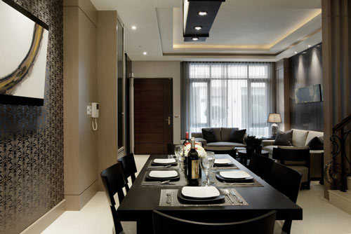 编辑点评:餐厅里运用镂空格栅烘托厅室穿透感,特意选择身型简炼低矮的家俱维系空间开阔感。