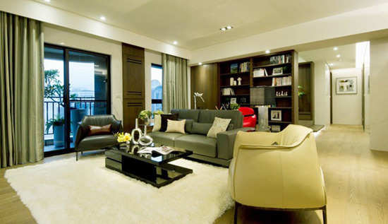 125平现代简约温馨婚房,业主做了榻榻米设计,在这榻榻米的中间做了一个吧台的设计,结休闲娱乐为一体,功能性更强,客厅中红色的转椅更点亮了整个空间。