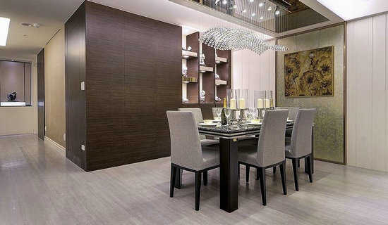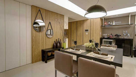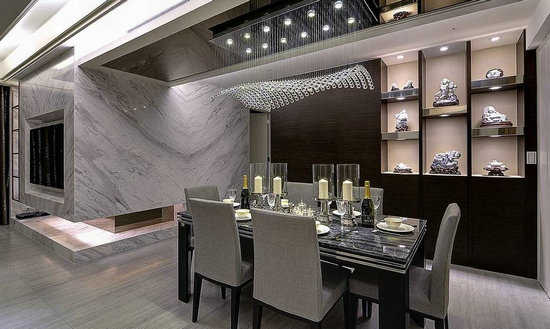编辑点评:电视主墙的石材量体,一体成形转折到走道,看来利落的设计手法,更巧妙在走道墙面隐藏大量收纳柜。位在隔间梁下方的餐厅,先以茶镜消弭压迫感,再藉由一盏漂浮感的透亮水晶灯,转移众人目光。