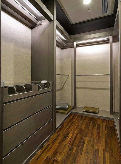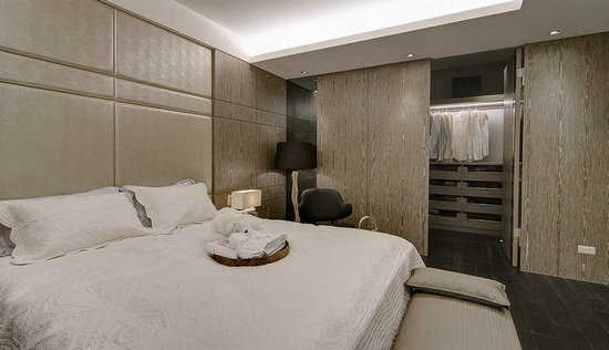 十分孝顺的单身屋主,希望能和长辈同住就近照顾父母,因此艺术总监张静峰改造格局,打造出两间同等条件的双主卧,各自拥有配备完整的四件式浴室、独立衣帽间。而天地壁的材质,无一不是精挑细选而来,如边框衬以镀钛金属,质感细致的发丝纹,体现犹如五星级酒店的低调奢华。