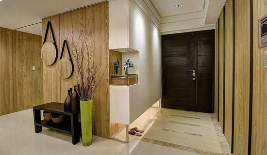 编辑点评:结构柱、总开关箱、鞋柜等多元机能皆整合于木质温润的简约立面里。