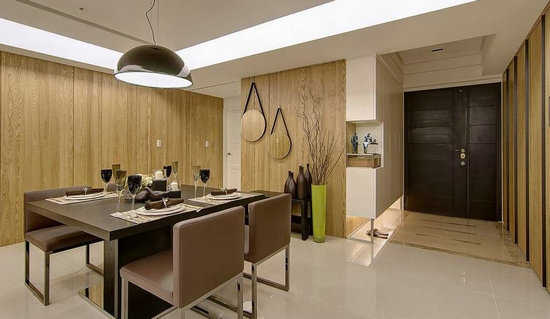 编辑点评:从玄关白色鞋柜转圜至餐厅木质主墙端景处,特意凿空的小平台可置放雕塑艺品,下方的木质小抽屉也让空间衔接更为流畅。